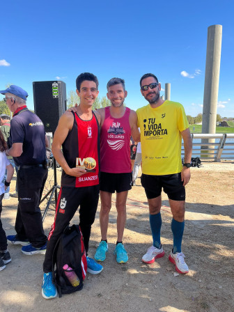Y para cerrar nos vamos a la Carrera Contra el Suicidio, un evento enmarcado el fin de semana dedicado al día mundial de la salud mental, que se celebró en el Parque Juan Carlos I sobre 10 km y que tuvo a Miguel del Pozo como campeón y Sergio Carro, tercero con él en el podio. Junto a ellos también participó Alejandro Roldán, uno de los pupilos de Sergio en el club, que aparece aquí en la foto.