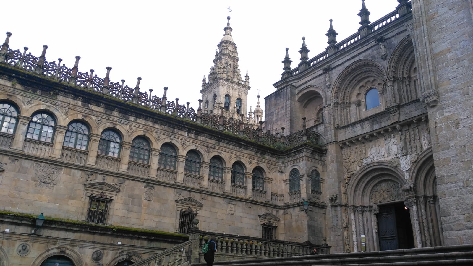 Se me hacía necesario separar el esfuerzo físico y mental de haber recorrido 799 km del Camino de Santiago francés, del verdadero propósito del reto: pedir al Santo por la salud de la familia y l@s amig@s, y en especial de algun@s de estas personas, como si de una lista de peticiones se tratase, y así era. Ya no iba a ir corriendo, sino con tranquilidad y sosiego y con esa lista en mente. Siguiendo el Camino, me desvié por unos momentos para ir a la estación de autobuses a sacar el billete de vuelta y dejar la mochila en consigna (en la catedral no te dejan entrar con ella). Desde allí por la rúa dos Concheiros y luego la rúa das Casas Reais, Acibechería y la praza da Inmaculada, para acceder a la Praza do Obradoiro por el arco del palacio.